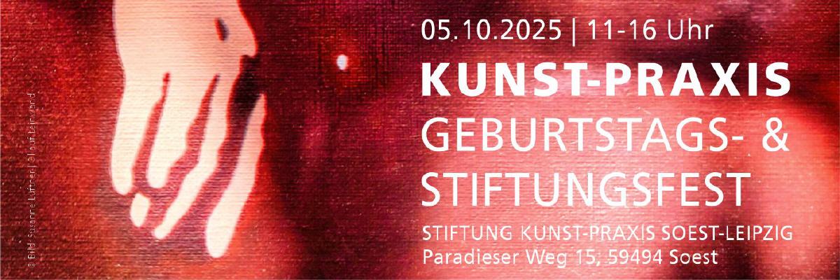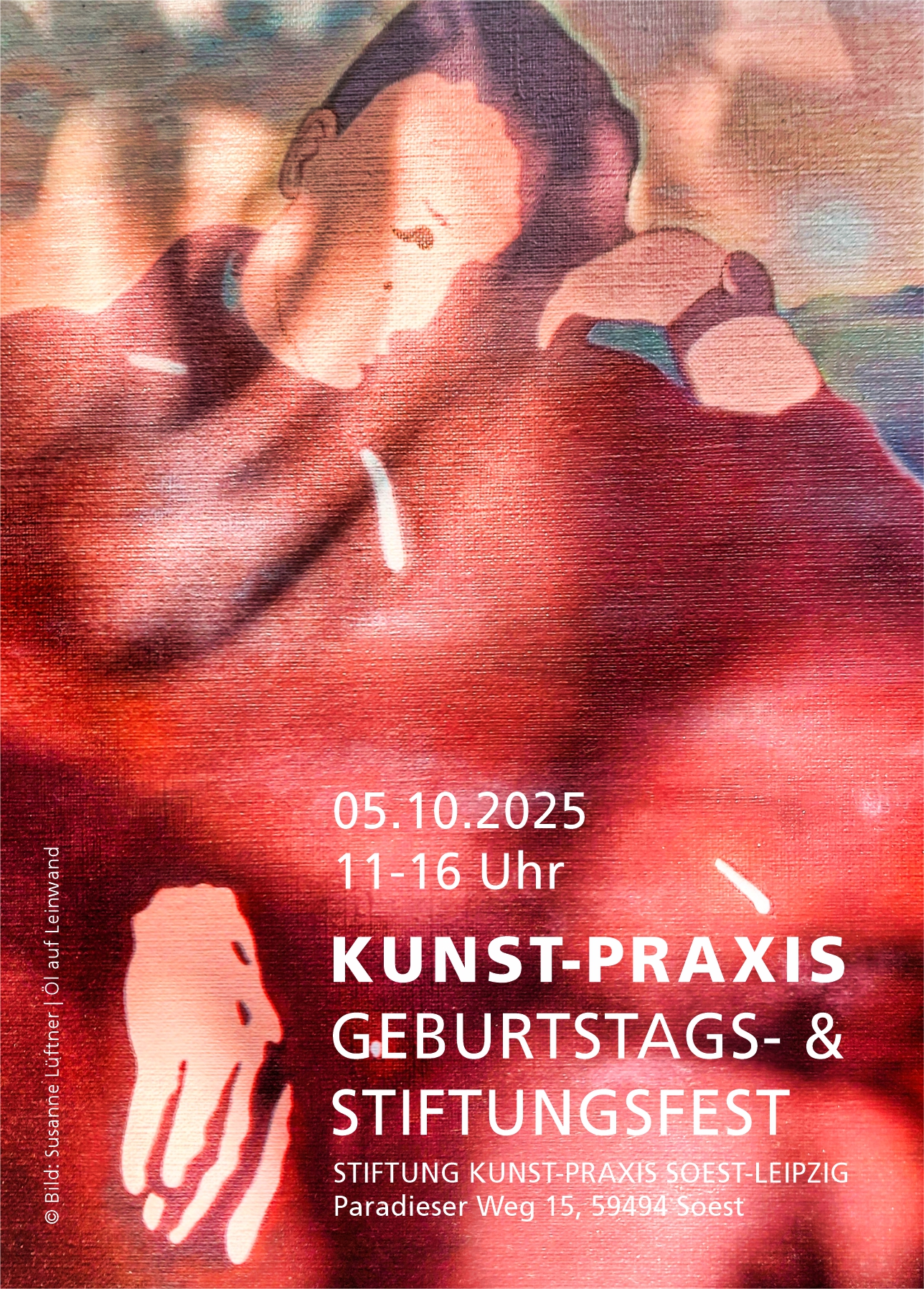 Die KUNST-PRAXIS mit dem MUSEUM SAMMLUNG SUSANNE LÜFTNER - OUTSIDER & MODERN ART wurde 1994 gegründet. Sie ist ein Ort für außergewöhnliche Kunst, Persönlichkeitsentwicklung, Kommunikation und Begegnungen. 2024 feierte die KUNST-PRAXIS ihr 30-jähriges Bestehen. In diesem Jahr gründeten Horst Braukmann und Susanne Lüftner die STIFTUNG KUNST-PRAXIS SOEST-LEIPZIG. Wir laden zur Feier dieser Entwicklung und zum 31. Geburtstag der KUNST-PRAXIS am Sonntag, den 5. Oktober, herzlich ein. ... mehr mit Programm.